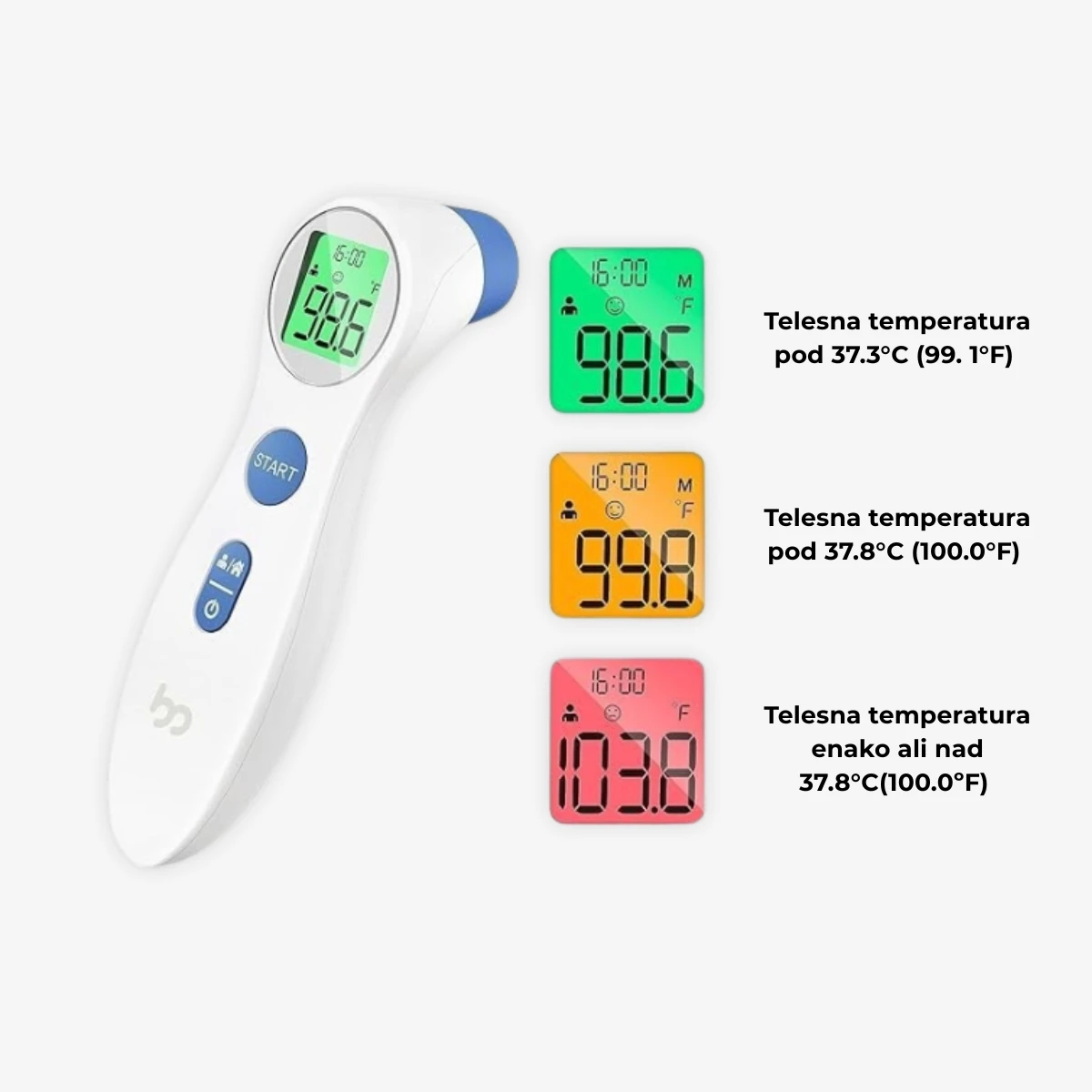 - 1-sekundno odčitavanje — izjemno hitro merjenje, popolno za nemirne dojenčke in male otroke, ki ne mirujejo.